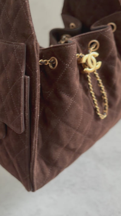 The Chanel 26C Small Hobo Bag in Dark Brown Suede is a sophisticated piece that captures the essence of modern elegance. Crafted from soft, quilted suede leather, this bag showcases Chanel’s timeless craftsmanship with a luxurious texture and a rich dark brown hue. The front features the iconic interlocking CC logo in gold-tone, adding a refined accent that enhances its classic appeal.