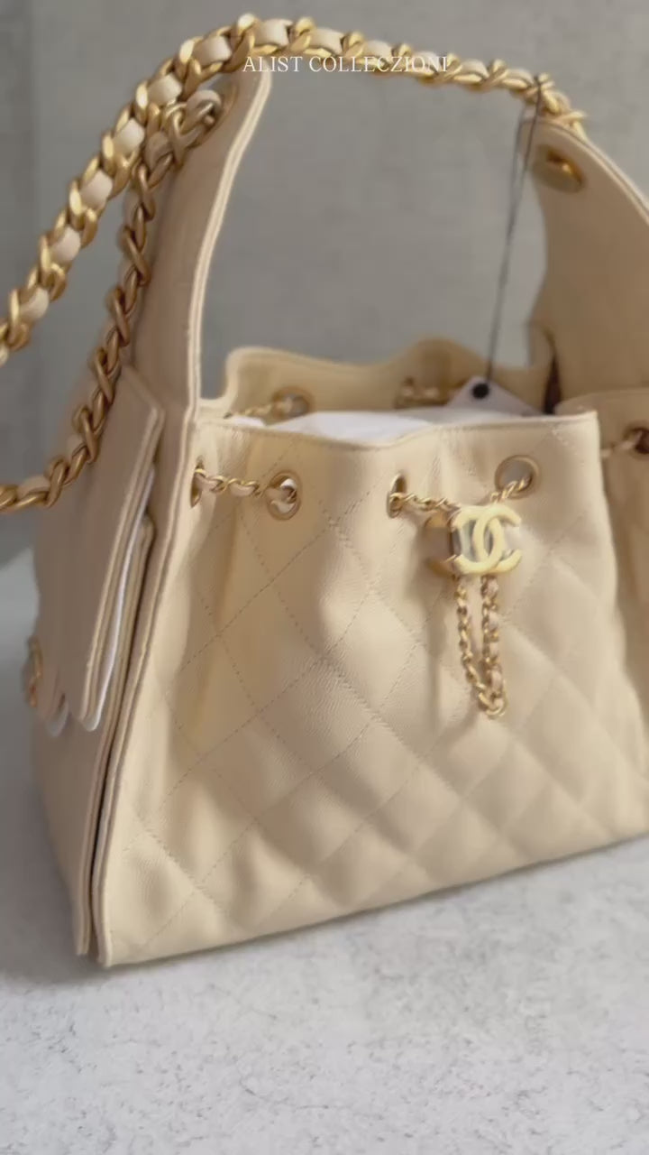 Designed with practicality in mind, the bag features a spacious interior that allows you to carry your essentials with ease, while the drawstring closure adorned with the iconic interlocking CC logo adds a touch of luxury. The gold-tone hardware beautifully complements the soft beige leather, creating a refined and harmonious aesthetic.
