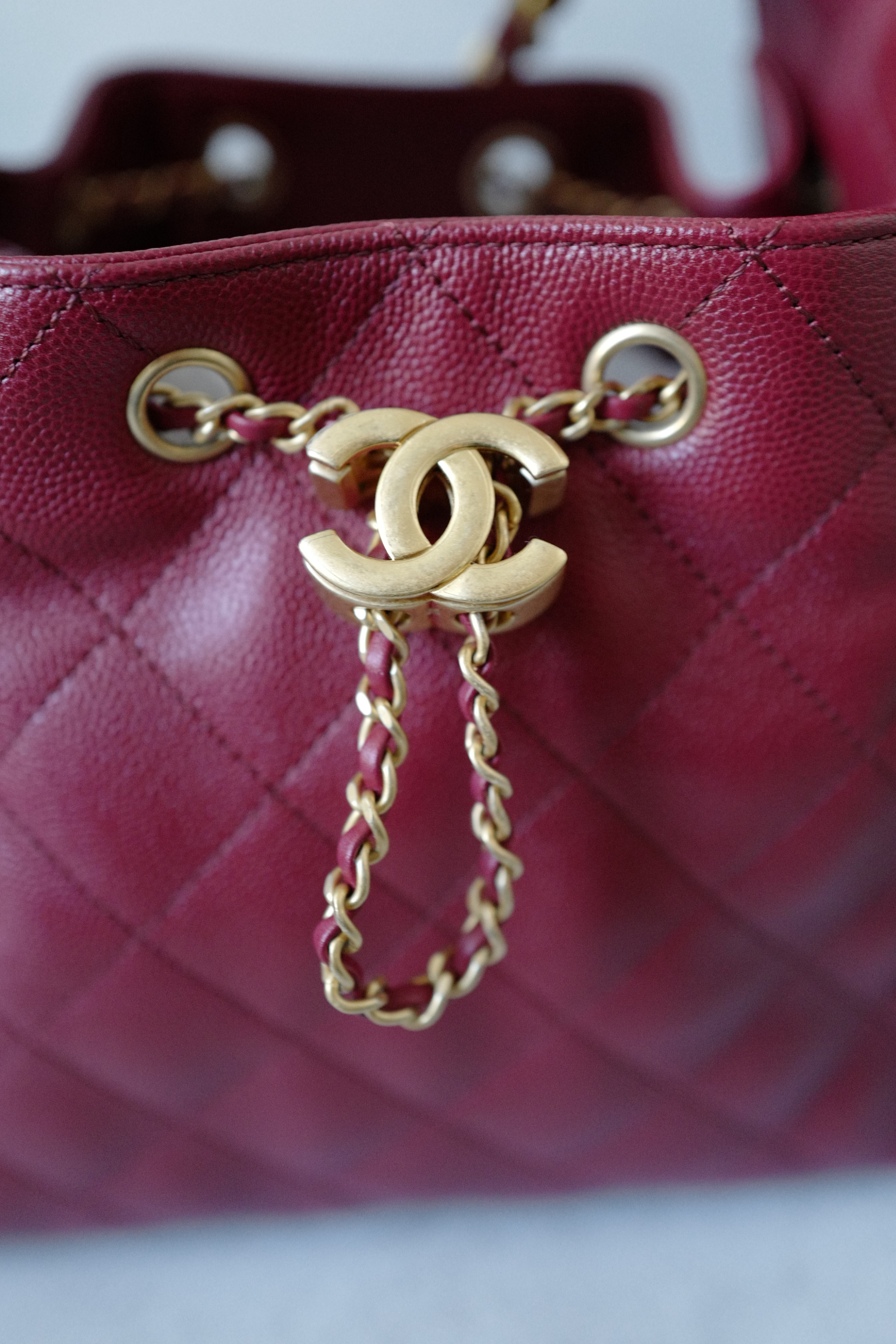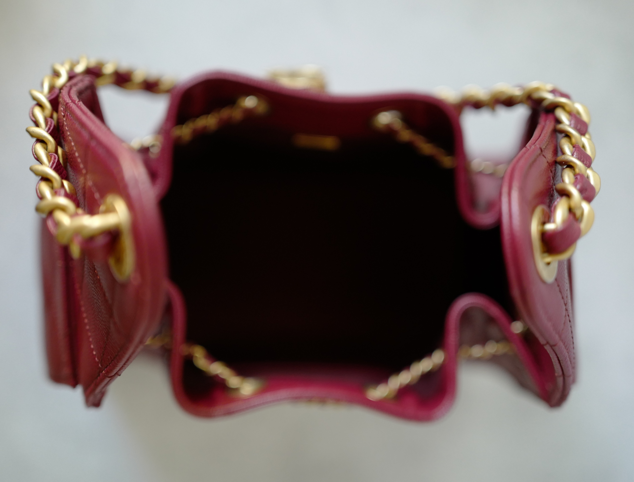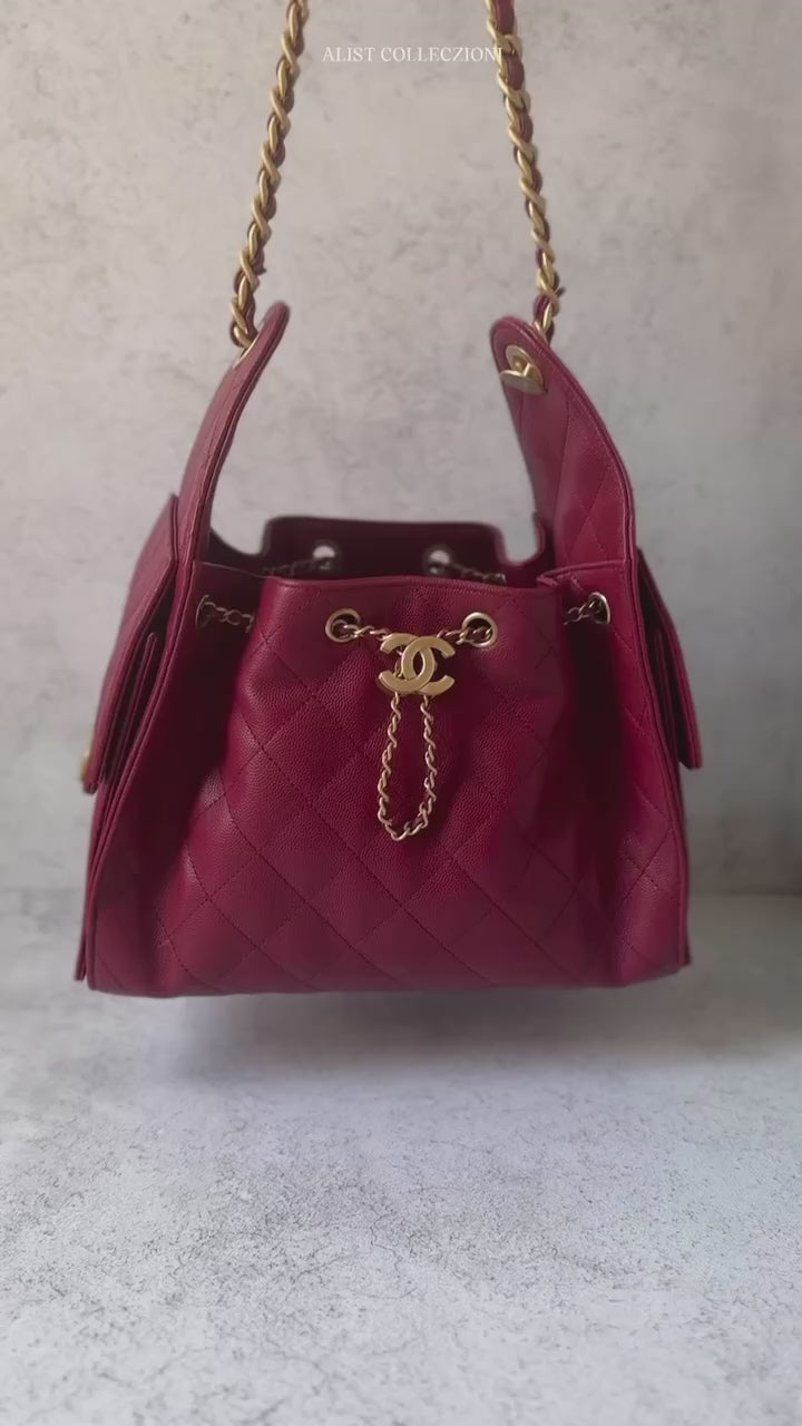 Made from durable grained calfskin, the leather offers a beautiful texture and subtle sheen while remaining resistant to wear. The drawstring-style opening adds a relaxed touch, and the chain-and-leather shoulder strap allows for comfortable and versatile styling. Its size is ideal for carrying daily essentials, making it a practical yet luxurious piece for everyday use.