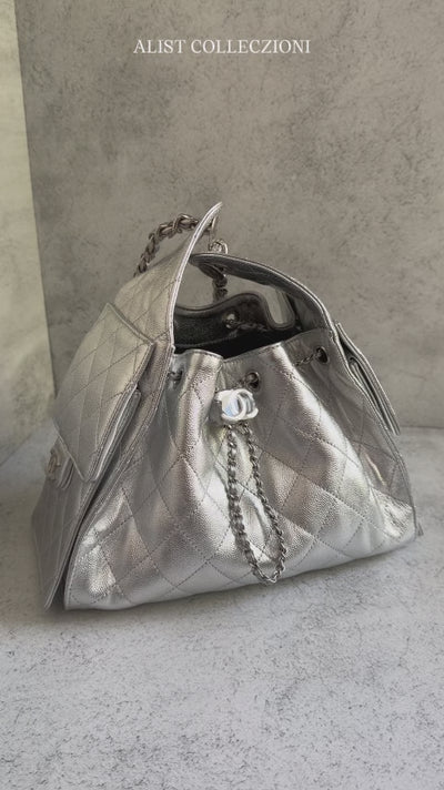 Introducing theย Chanel 26C Small Hobo Bag, a luminous expression of modern elegance shaped by the spirit of the Cruise 2025/26 collection. The fluid silhouette drapes effortlessly, offering a relaxed yet refined presence that feels both contemporary and timeless. Its metallic silver finish captures light with every movement, creating a subtle glow that elevates even the simplest ensemble.