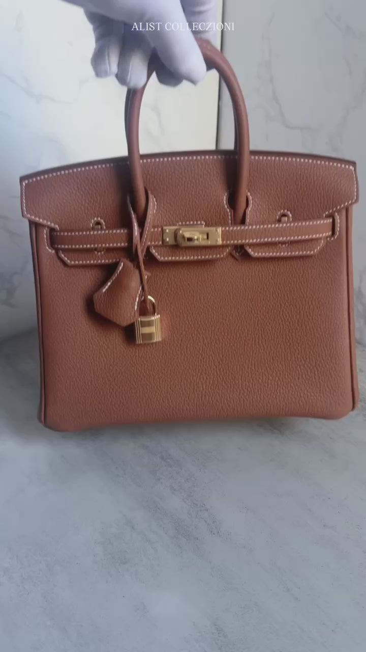 The Hermès Birkin 25 in Gold Togo leather with Gold Hardware is a timeless icon of elegance and craftsmanship. The rich caramel-brown hue, known as “Gold,” is one of Hermès’ most beloved colors—beautifully enhanced by contrasting white stitching and radiant gold-plated hardware. This combination embodies understated luxury and versatility, pairing effortlessly with any outfit year-round.