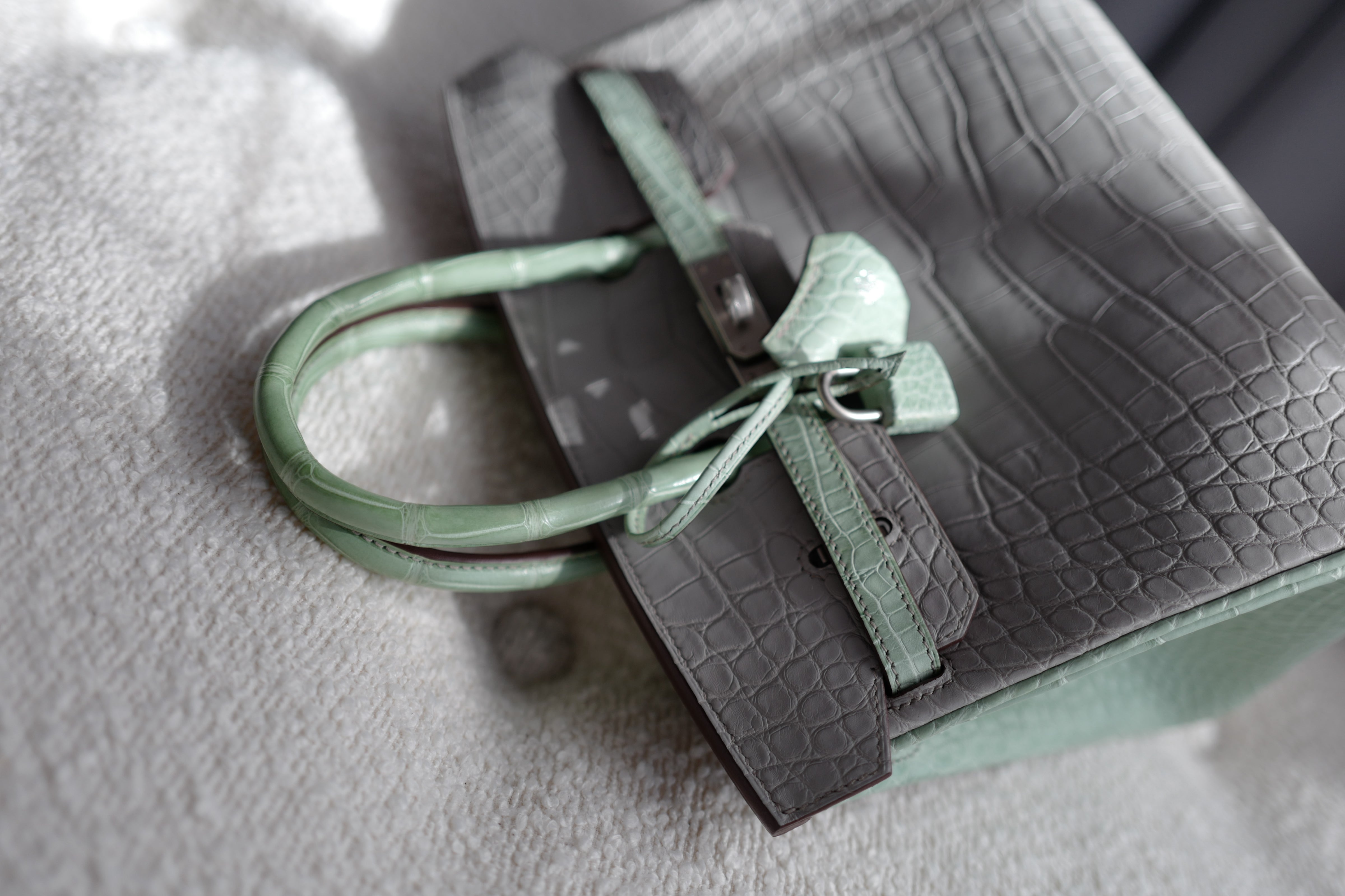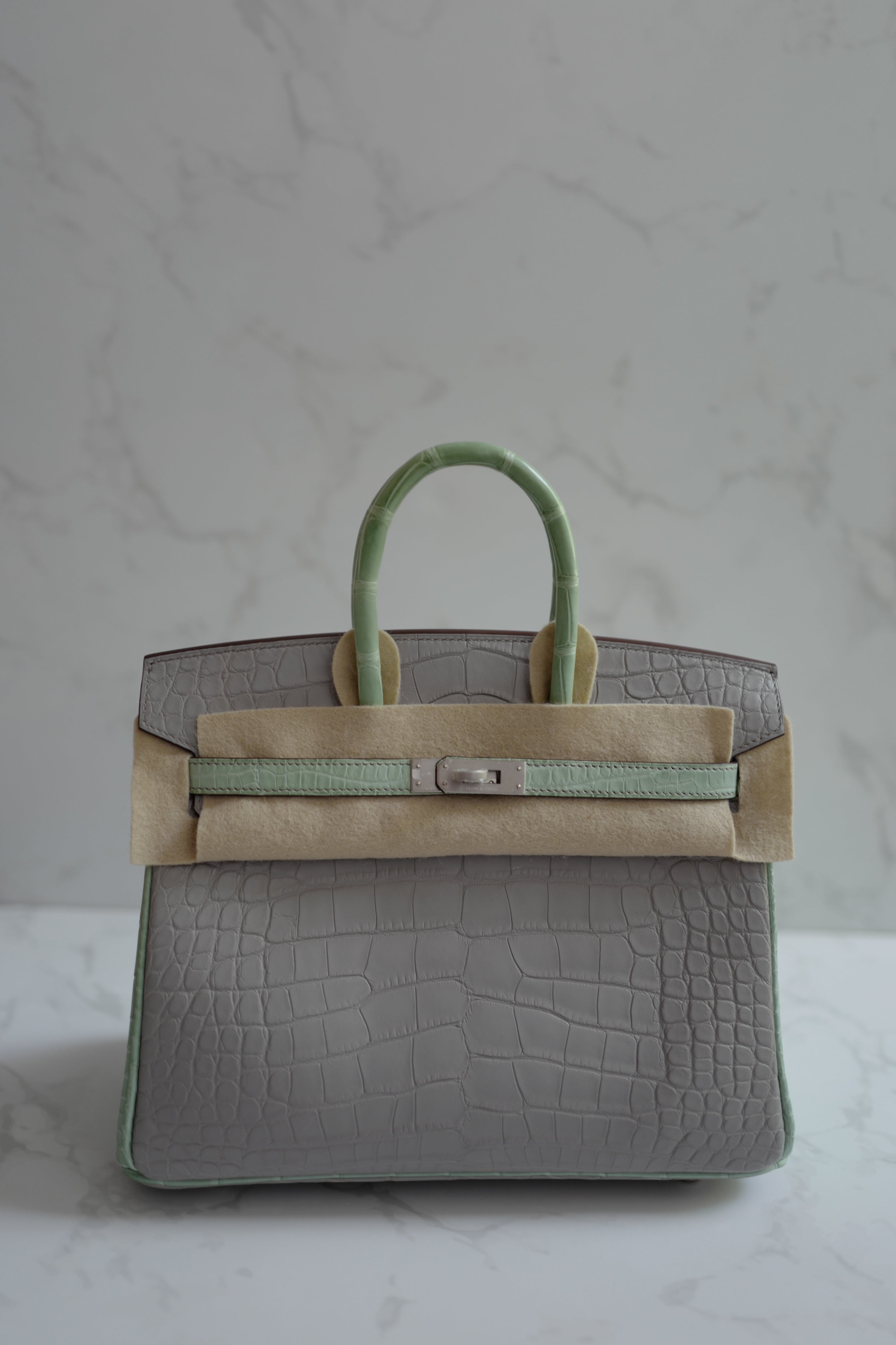 BNIB Hermes Birkin 25 HSS Gris Perle/Vert D’eau Matte Crocodile Brushed Palladium HW