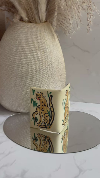 This is an authentic Hermès Calvi Duo Card Case in “Spring Panther” printed Swift calfskin, featuring a vibrant design by French artist Matthieu Cosse.