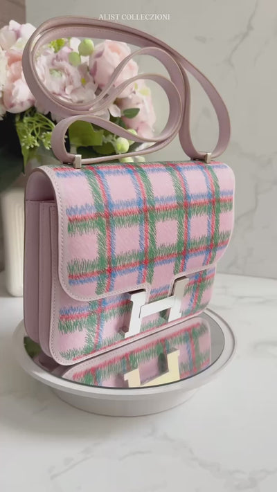 The Hermès Constance 18 Mirror Tartan is a striking blend of timeless elegance and playful modernity. Crafted in luxurious leather with a distinctive tartan-inspired motif, this limited-edition piece showcases Hermès’ mastery of color, texture, and craftsmanship. The combination of soft pink tones with vivid green and blue accents creates a bold yet refined aesthetic that stands out effortlessly.