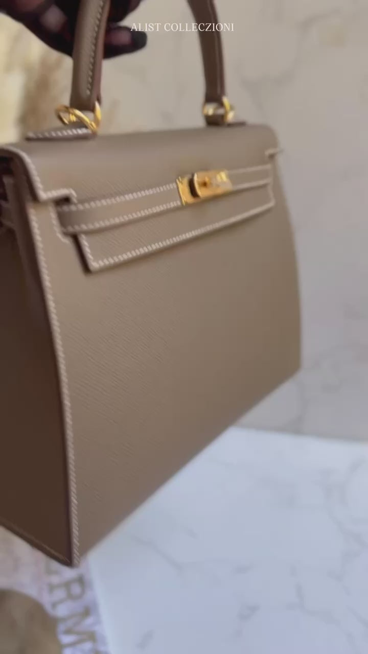 The Hermès Kelly 25 Sellier in Etoupe Epsom Leather is admired for its structured design and versatile neutral tone. The Etoupe color pairs beautifully with many outfits, making it suitable for both everyday use and more polished settings. Epsom leather has a fine grain and a lightweight feel, helping the bag maintain its sharp and elegant shape.