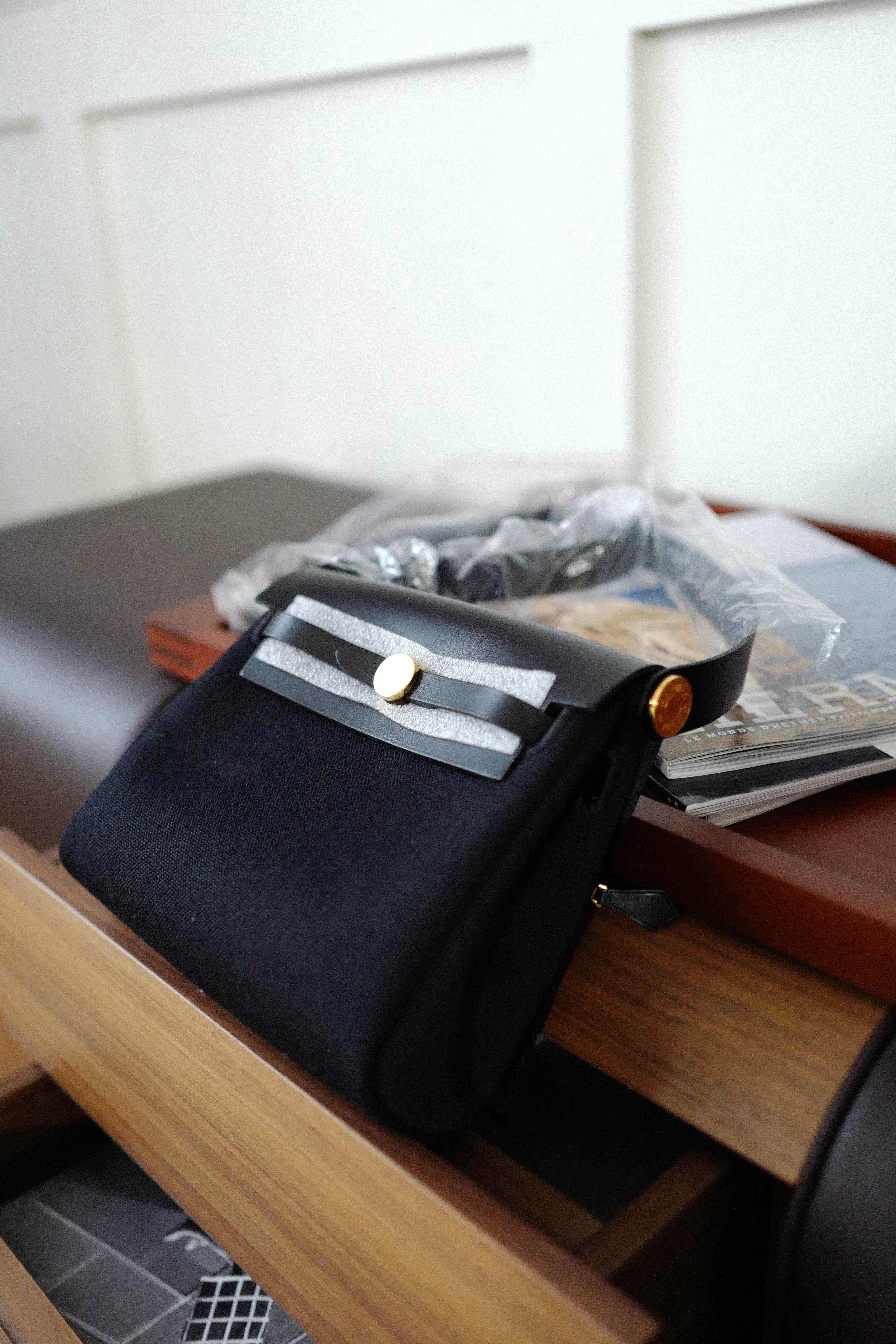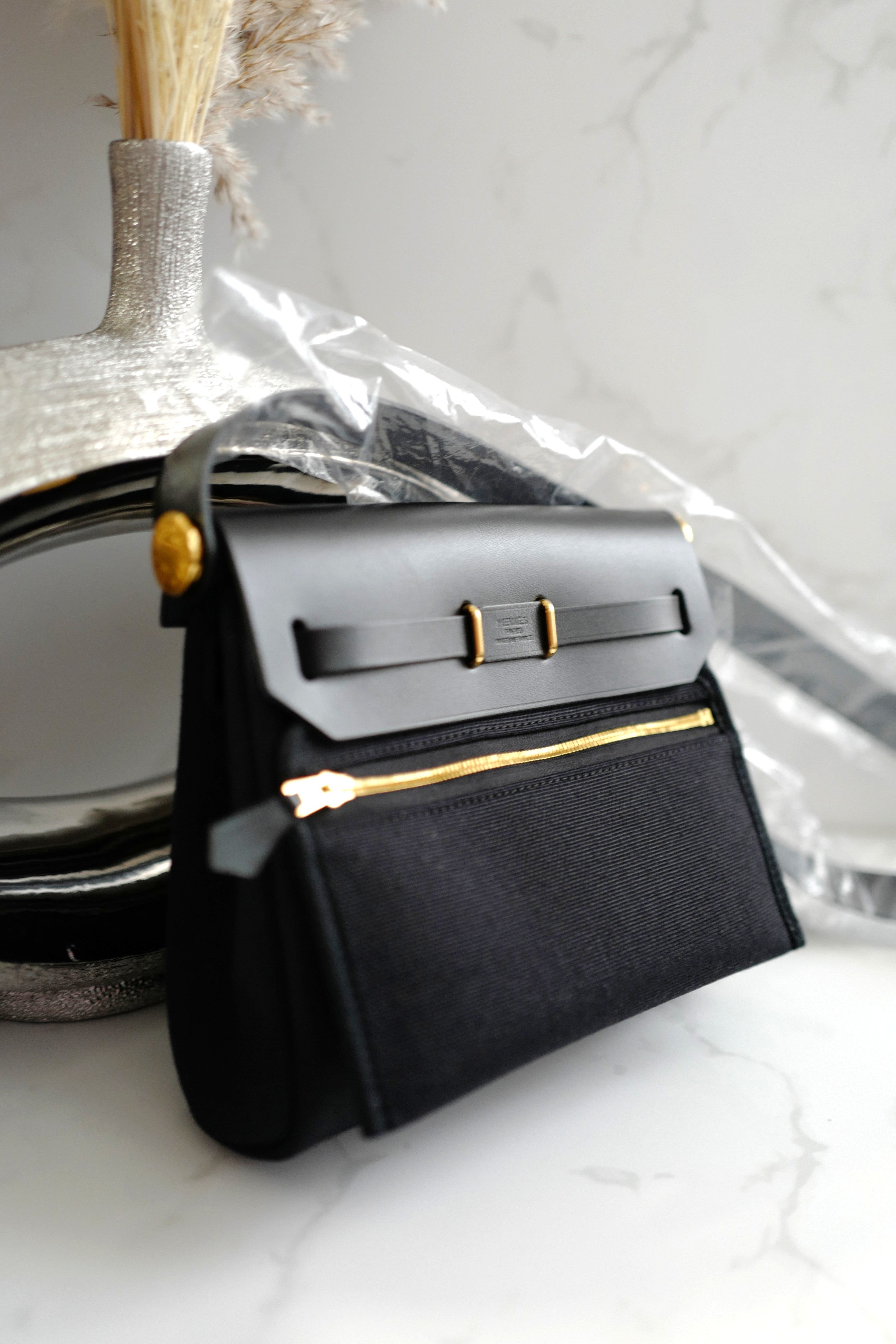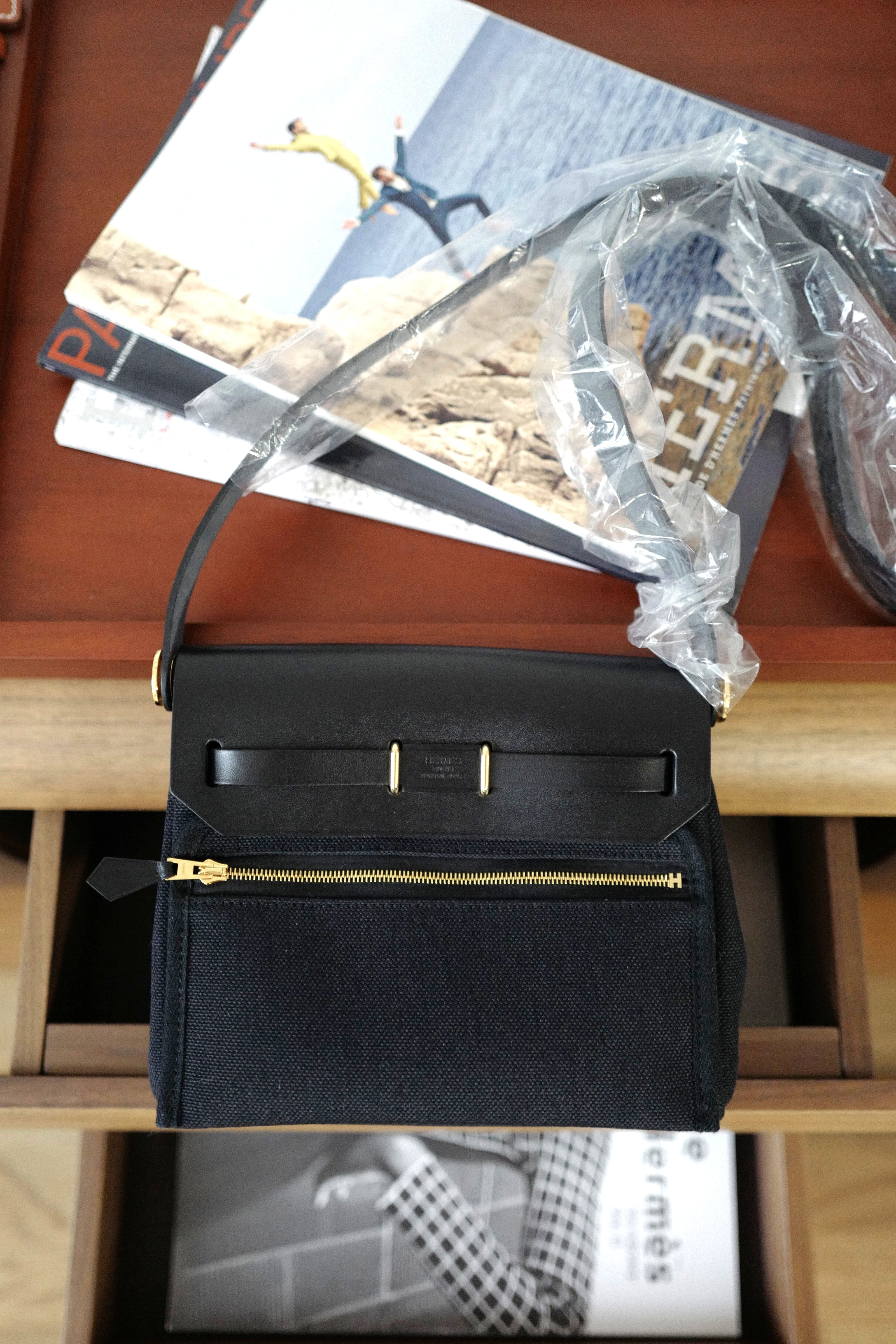 The Mini Herbag is often referred to as the little sister of the Kelly, featuring a detachable top handle, secure clasp closure, and interchangeable body for added versatility. This version, with its black and gold pairing, exudes Parisian chic—perfect for both day-to-night styling.