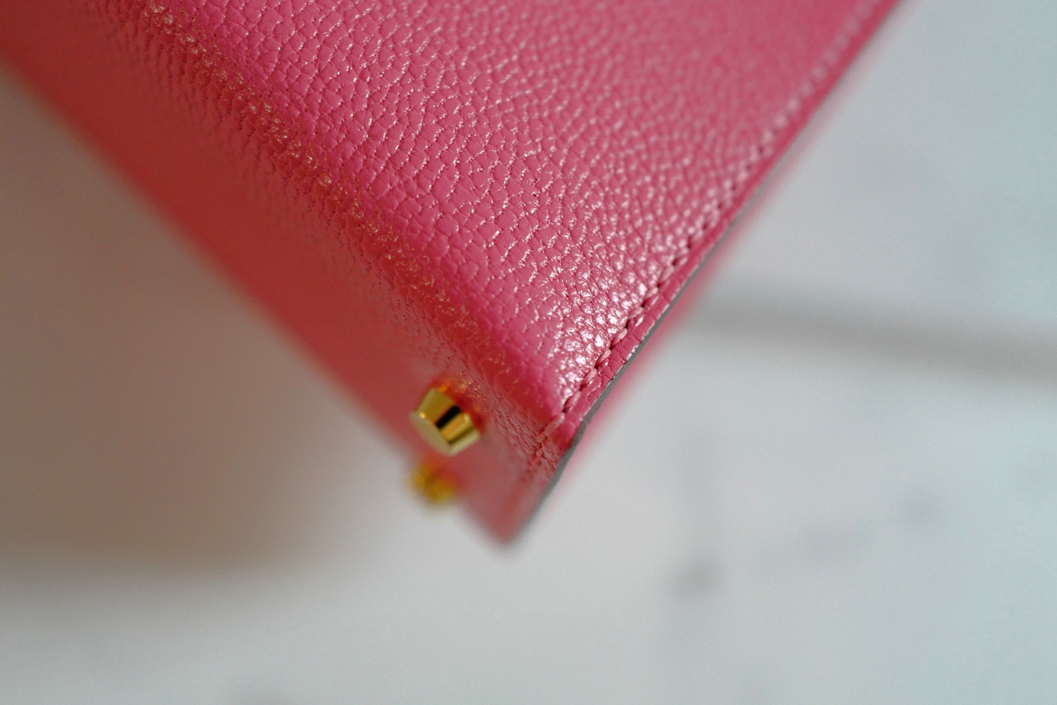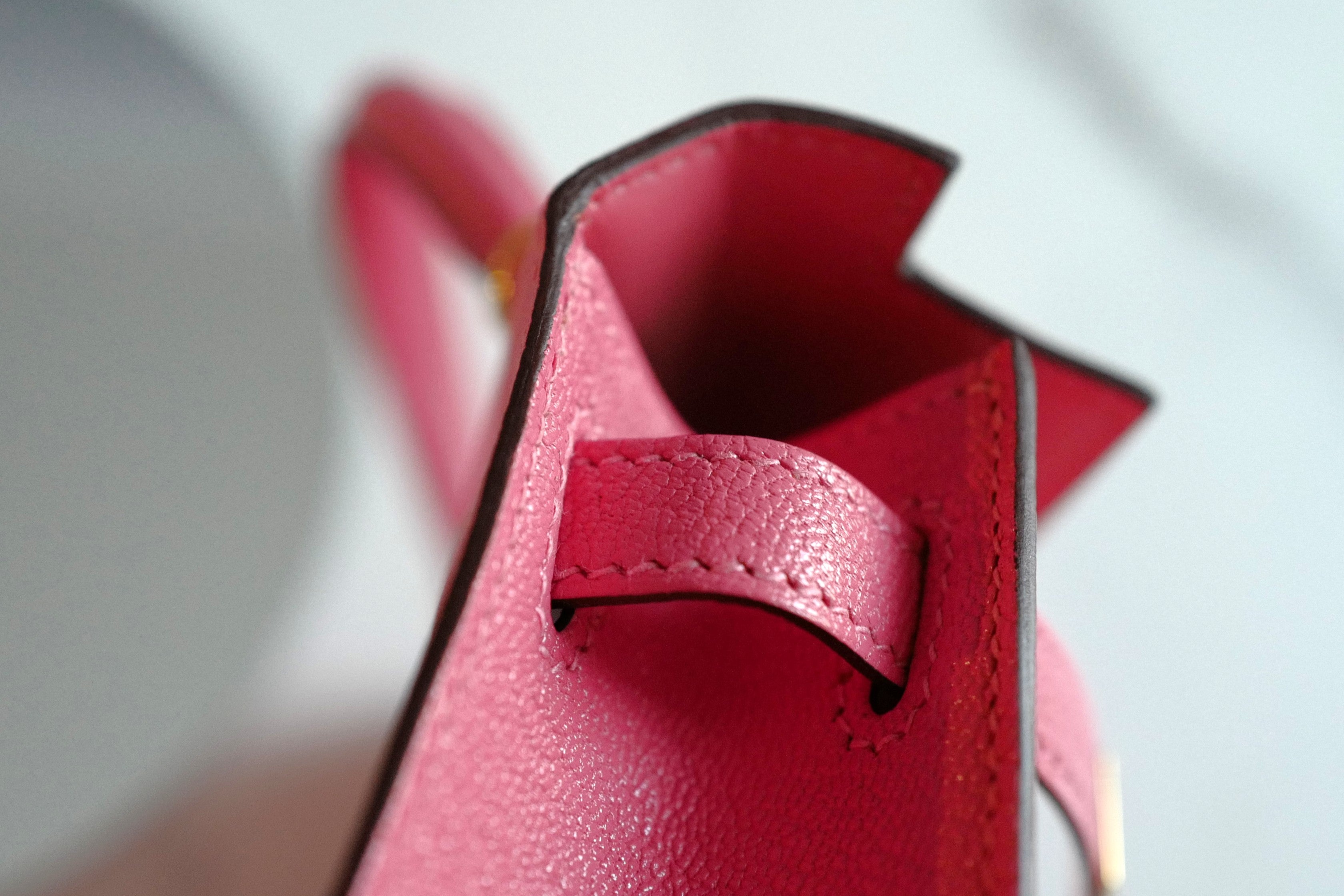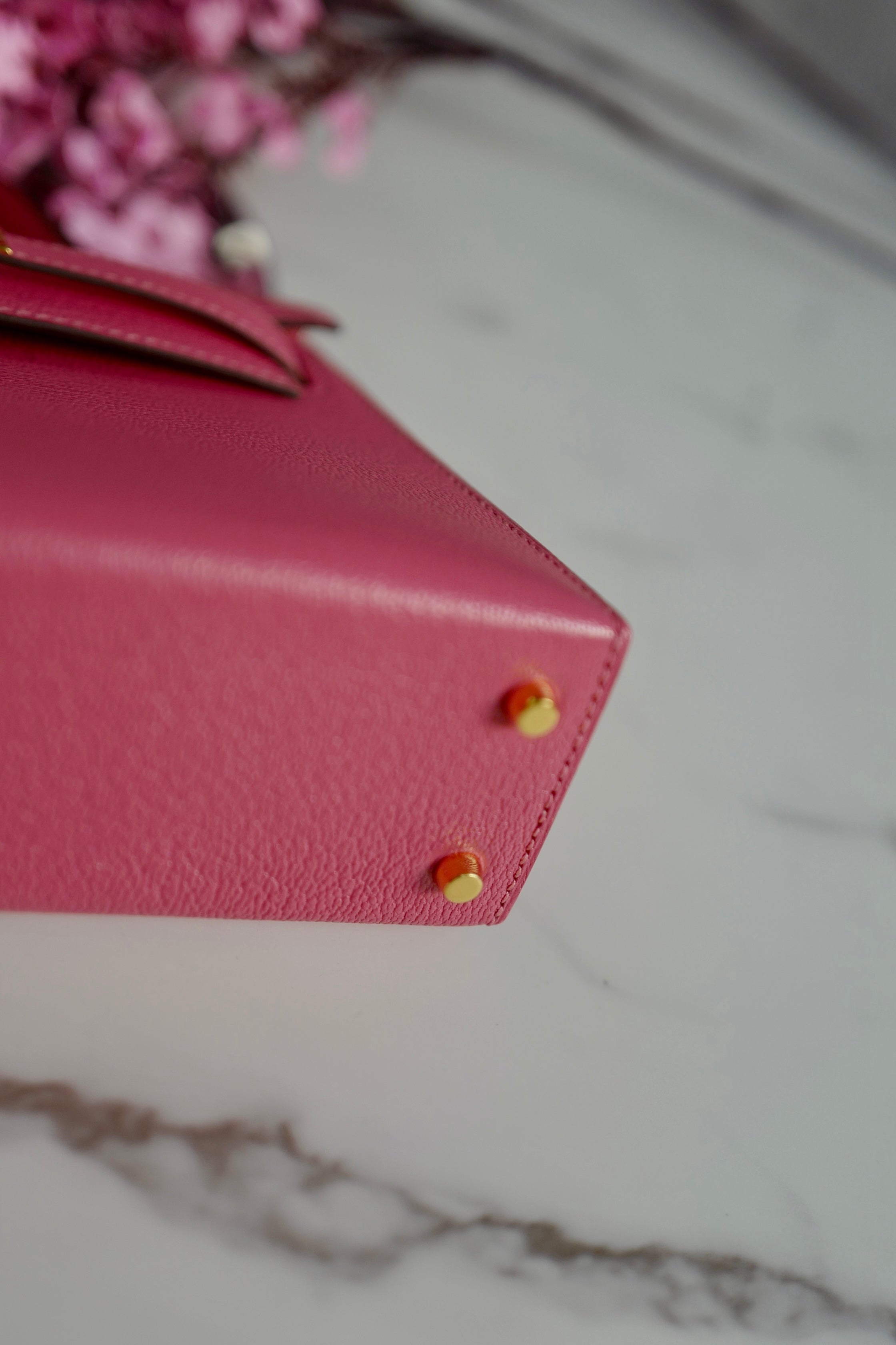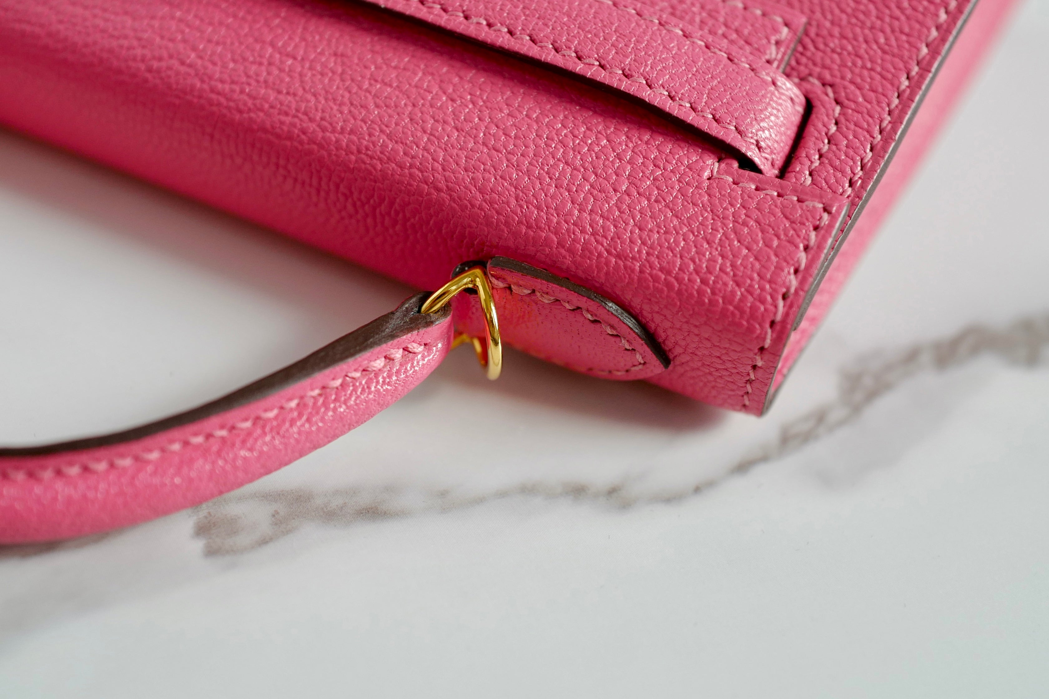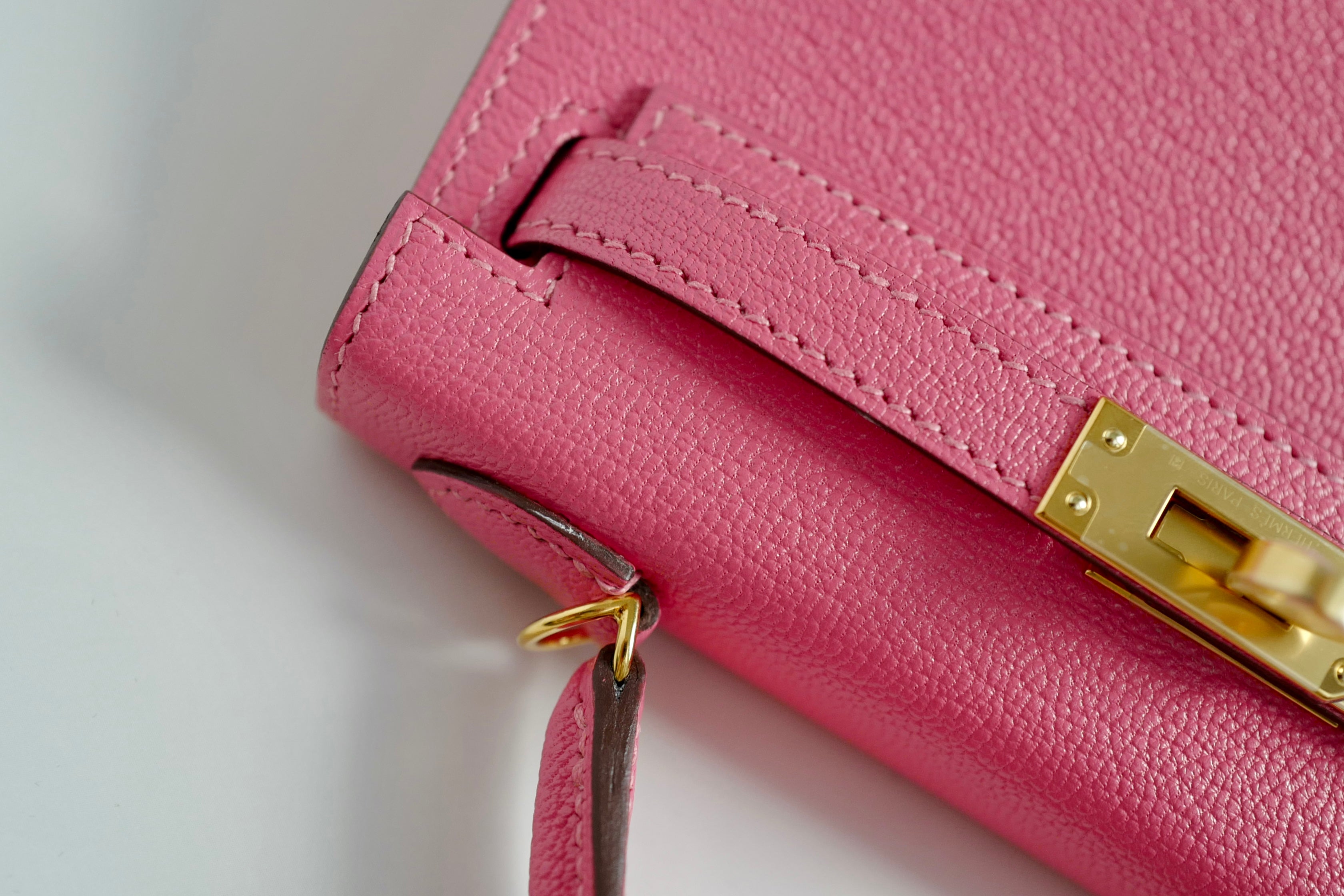 Introducing the Hermès Mini Kelly in Rose Lipstick in Chèvre leather with Gold Hardware—a truly exquisite piece that embodies the timeless elegance and exceptional craftsmanship synonymous with Hermès.