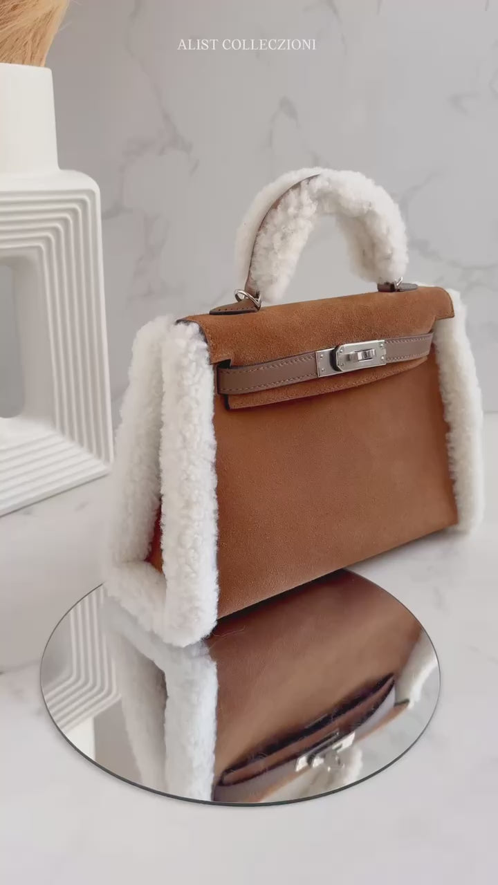 BNIB Hermès Mini Kelly Teddy Gold/Ecru/Alezan Shearling Suede Palladium Hardware
