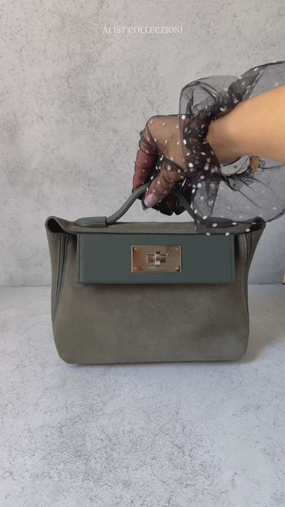 The Hermès Sac 24/24-21 is an exceptional creation that blends elegance and versatility in one compact form. Crafted from Veau Grizzly suede and smooth Veau Swift leather, this design offers a striking contrast between texture and structure. The Sable Gris exterior paired with Vert Mangrove accents creates a sophisticated color palette, perfectly highlighted by palladium hardware for a modern touch.