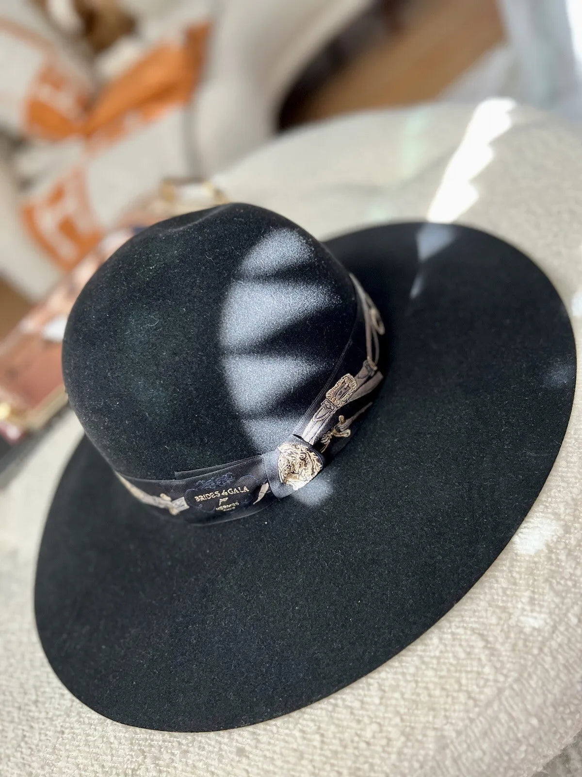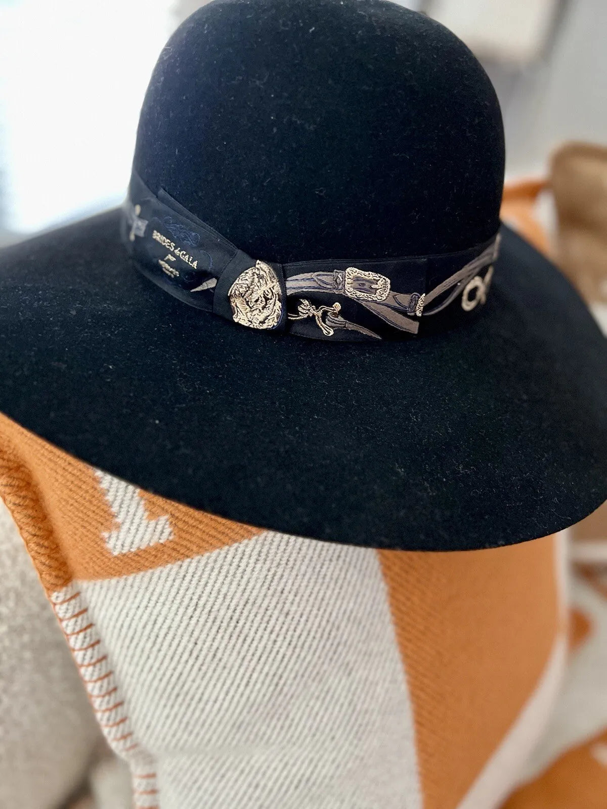 Indulge in sophistication with this exquisite black hat crafted from luxurious rabbit felt, adorned with a bride de gala motif headband in captivating gold and brown tones. The juxtaposition of colors accentuates the black hue, adding a touch of elegance to any ensemble. This signature bride de gala detail makes it a truly unique and coveted piece from Hermes. Versatile and timeless, the black color ensures effortless pairing with any outfit in your wardrobe.