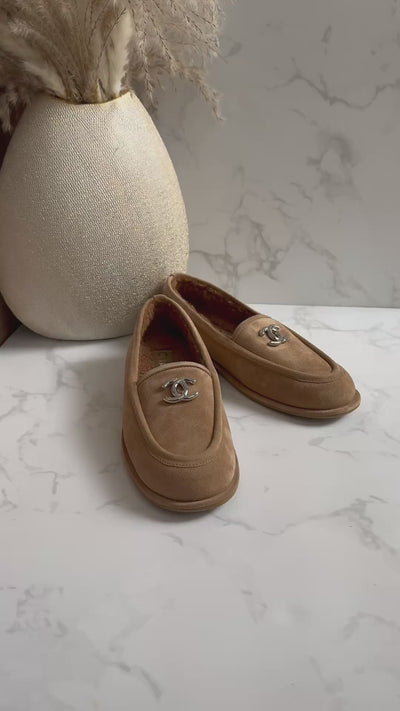 CHANEL 24K Shearling Lined Suede Calfskin CC Loafers Moccasins Shoes Dark Beige Size 38