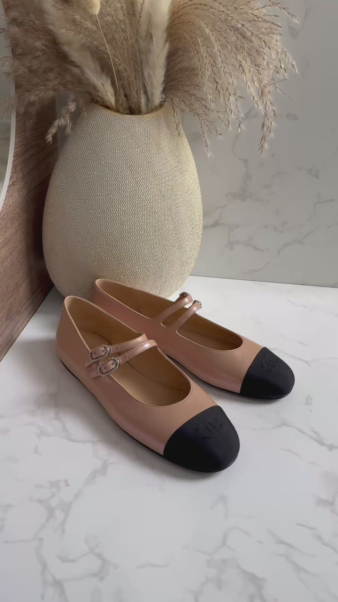 Crafted from supple beige lambskin leather, these classic flats feature a contrasting black crossgrain cap toe—an iconic Chanel detail—finished with a subtle stitched CC logo for a touch of signature sophistication. The dual strap design is secured with chic silver-tone pearl buckles, adding a refined, feminine edge to this versatile silhouette.