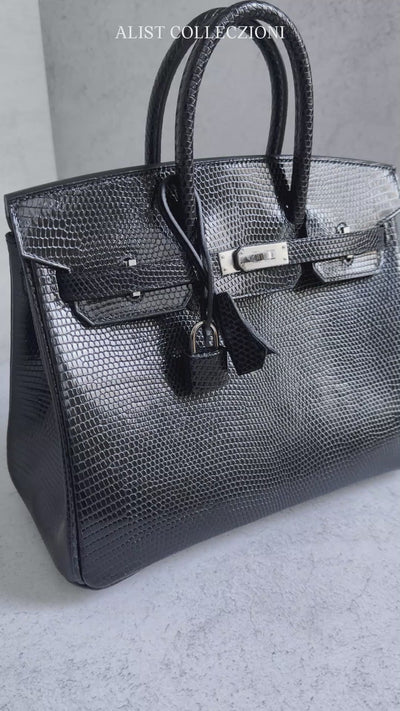 - Details: Color: Black, Material: Lizard Leather, Hardware: Palladium Hardware (PHW), Closure: Signature Hermès Turn-Lock, Shape: Structured Satchel / Top Handle Bag