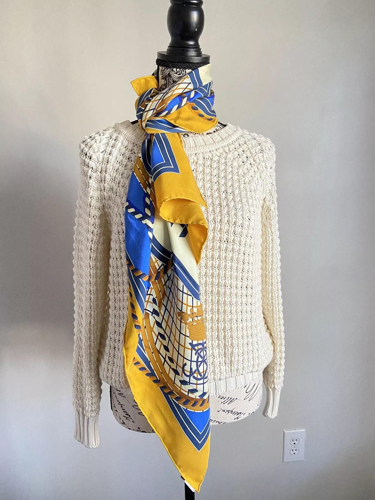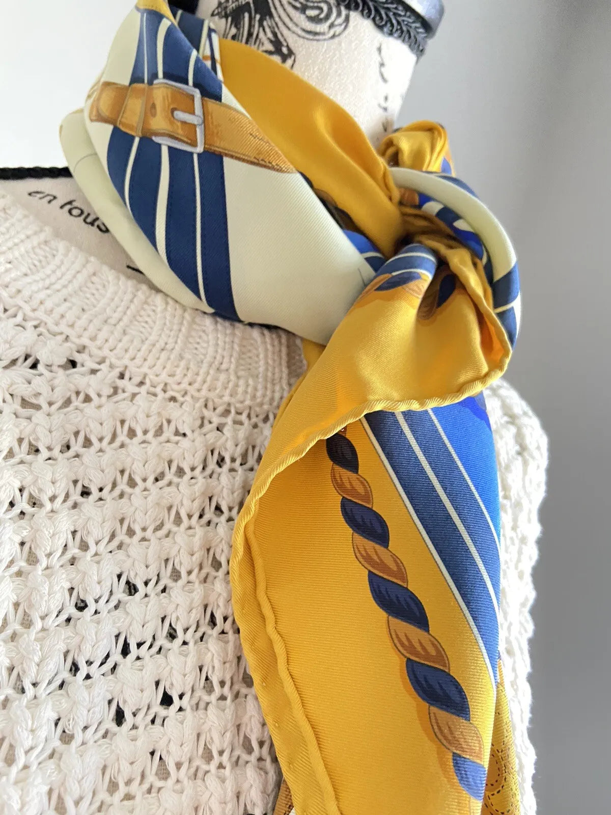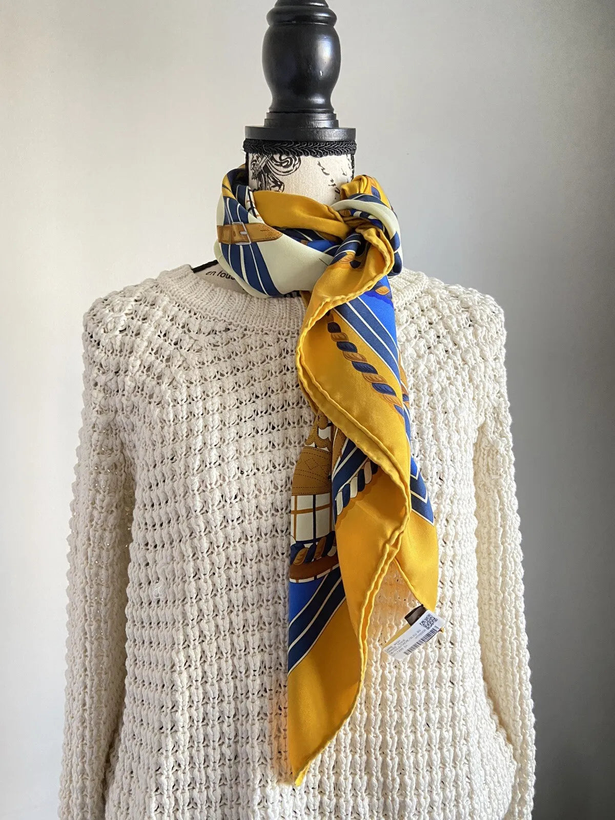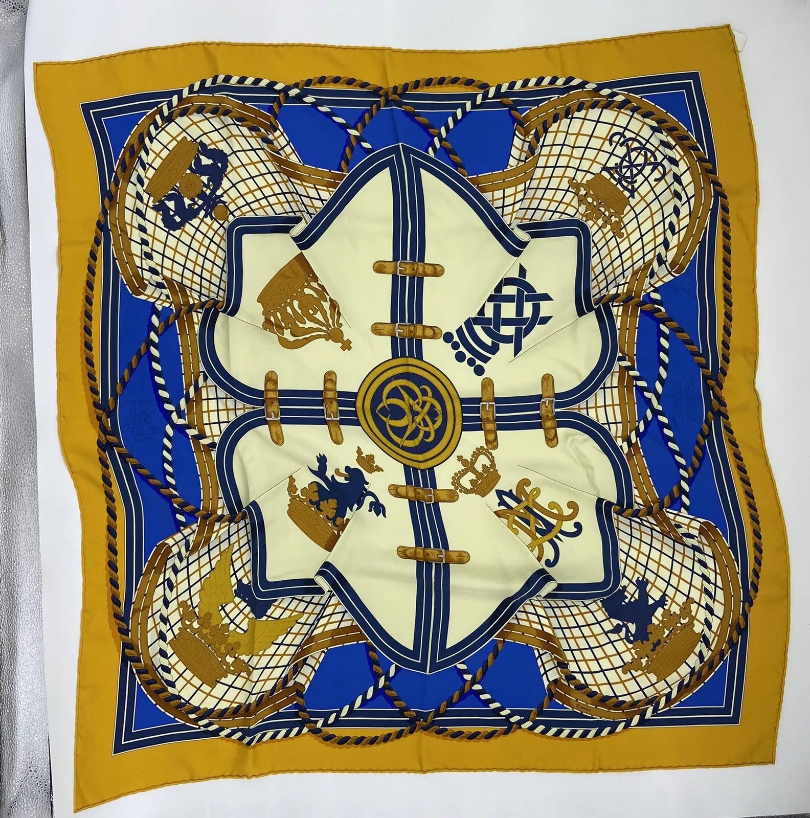 Hermes Carre Wash Grande Tenue Silk Scarf 90 X 90 cm Gold / Creme / Bleu Roy