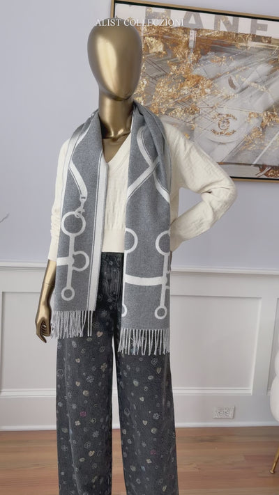 The scarf highlights Hermès’ attention to detail, showcased through precise weaving, a clean graphic equestrian pattern, and beautifully finished fringed edges. Lightweight yet insulating, it is ideal for layering throughout the seasons. Whether draped over the shoulders, wrapped around the neck, or worn as a statement accent, this piece elevates both casual and formal ensembles.