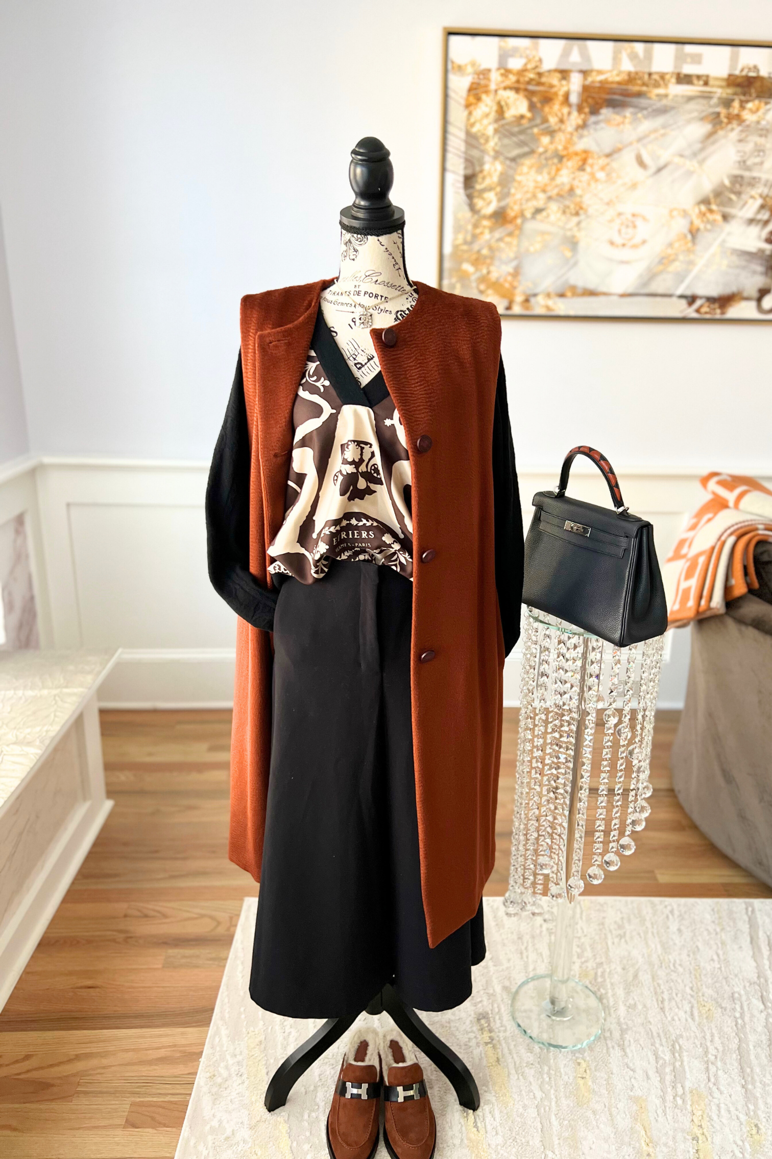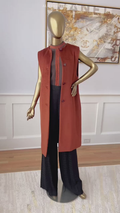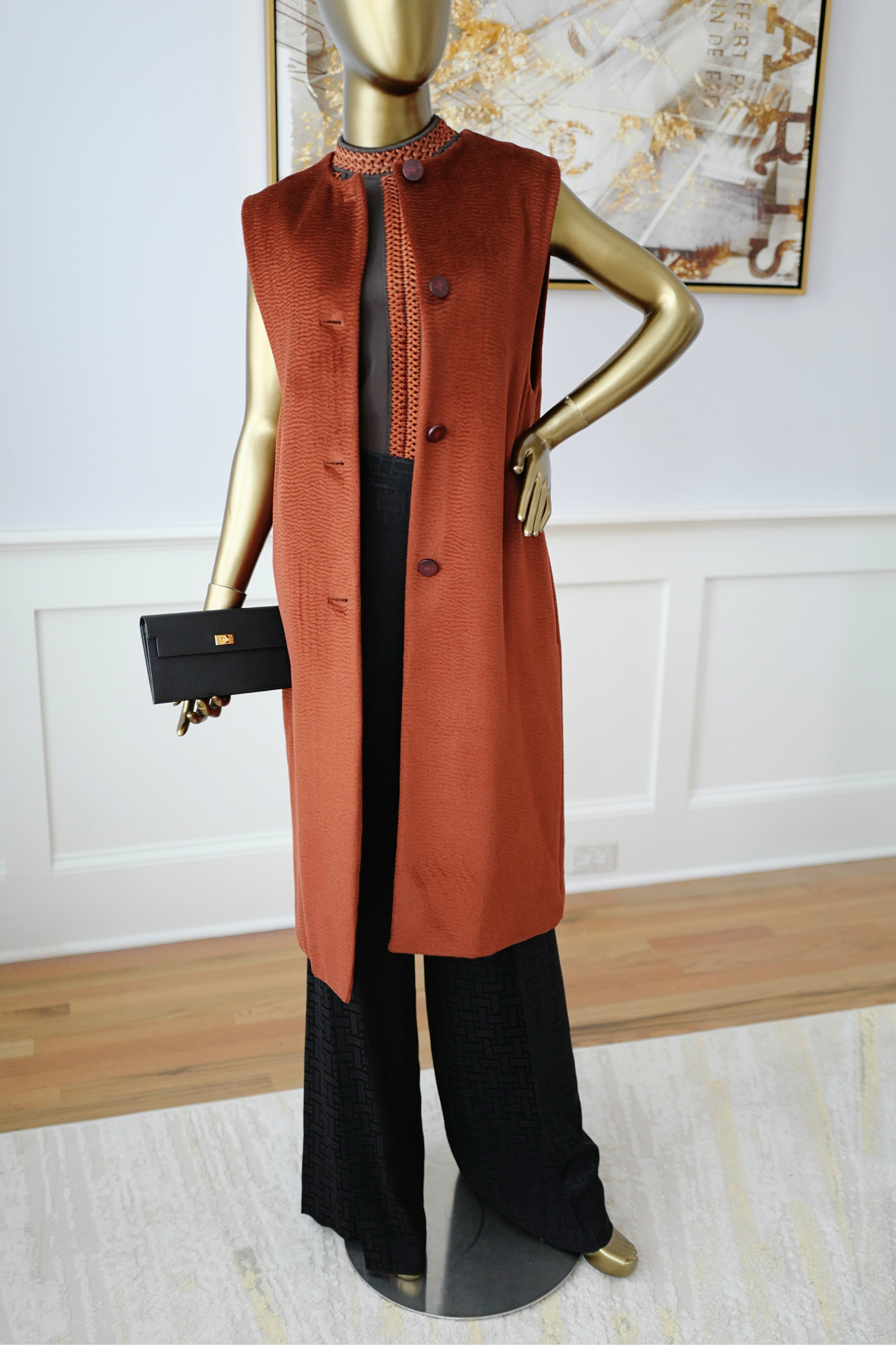 This gilet long vest is versatile in styling: wear it over a blouse for refined office wear or layer it over a turtleneck for an elegant evening look. It’s a rare find in the Rouge de Falun tone, perfect for collectors or fashion lovers seeking a standout outerwear piece with heritage and character.