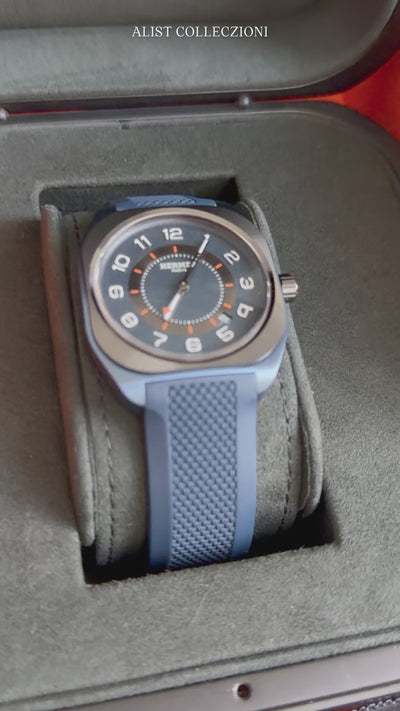 Completed with a blue rubber strap, the watch sits comfortably and securely, making it ideal for both active days and refined occasions. Water resistant to 10 bar and finished with a titanium folding clasp, the Hermès H08 is a sophisticated expression of modern luxury for those who appreciate understated excellence.