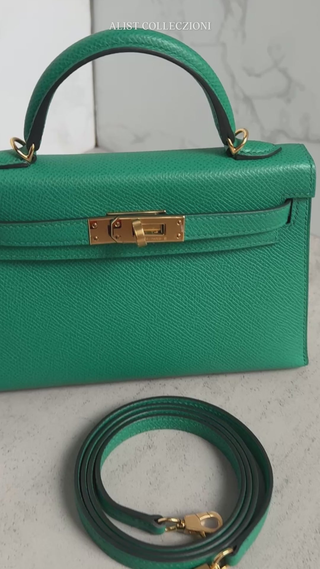 - Details: Hermès Mini Kelly 20 in Vert Jade Epsom leather with gold hardware, featuring a structured Sellier design, signature turn-lock closure, single top handle, detachable shoulder strap, and matching leather-lined interior