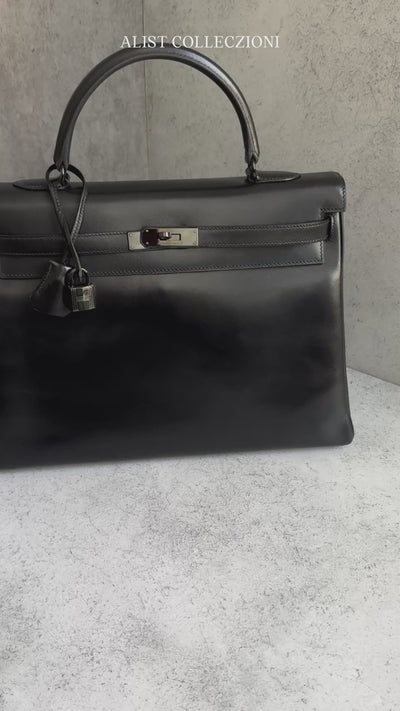 The Hermès Kelly 35 So Black is a study in quiet power and refined presence. Rendered in luminous black Box calf leather, its sleek surface reflects light with a subtle gloss that enhances the purity of its silhouette. The signature Kelly structure, defined by its trapezoid form and elegant top handle, creates a look that is both timeless and commanding.