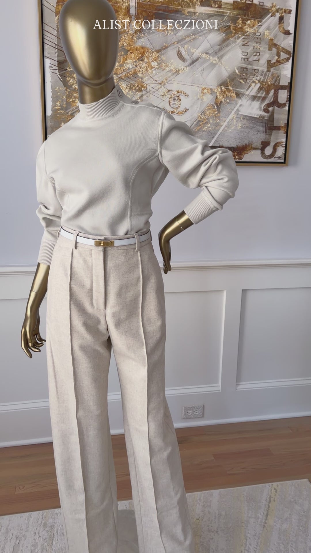 Distinctive Hermès details are highlighted through the mock neck collar and Ferronnerie-inspired decorative shoulder buttons. Subtle front and back cut-outs create visual interest, while the rib-trimmed collar and cuffs offer a clean and polished finish. These thoughtful elements enhance the overall design, giving the sweater a unique and refined appearance.