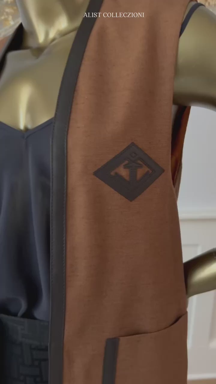 A re-edition of a reversible sleeveless jacket designed by Lola Prusac, in Marron Muscade silk shantung with a Nappa lambskin trim, with a leather anchor patch based on a drawing by Jean-Baptiste Dumas. This unique combination of heritage design and premium materials highlights the artistic roots of Hermès. The open-front silhouette and elegant construction allow the jacket to drape beautifully while maintaining a clean, modern shape.