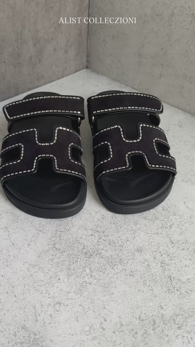 - Details: Hermès Chypre Sandals | Noir Calfskin Suede | Rhinestone Detail | Iconic "H" Cut-Out