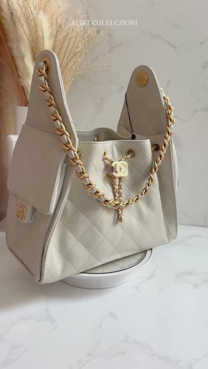 The design is accentuated with shiny gold-tone hardware, including the interlocking CC charm and luxurious chain strap, offering the perfect balance of refinement and statement appeal. Its drawstring-style closure adds a modern edge while ensuring your essentials remain secure. Compact yet functional, this hobo bag is sized to fit daily must-haves without compromising its sleek aesthetic.