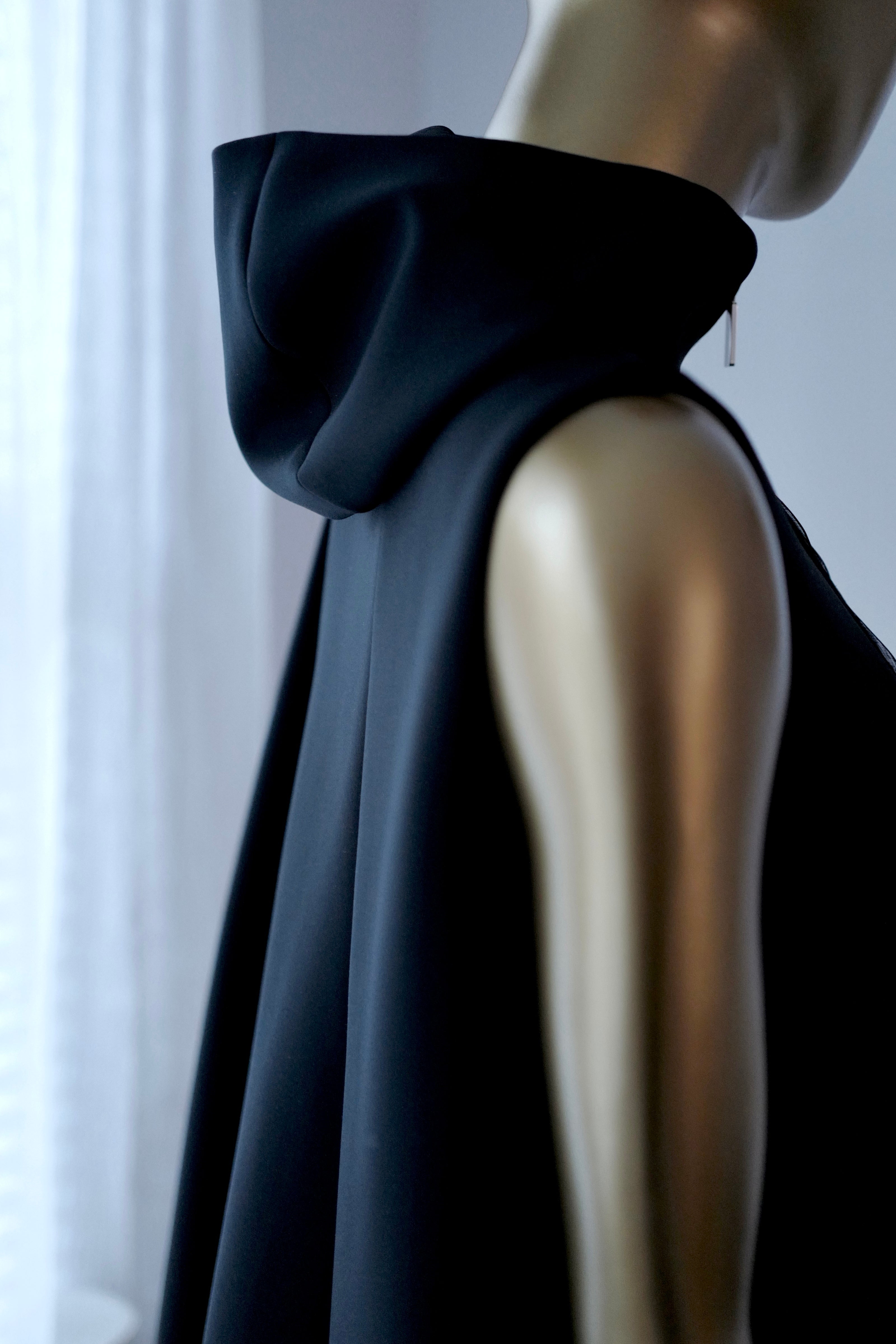 The dress features a high neckline and hoodie design, with a zipper up front for easy wear. Its slimming and comfortable fit, making this little black dress perfect for any occasion, whether it be for travel, weddings, holy communion, parties, cocktails, or workwear.
