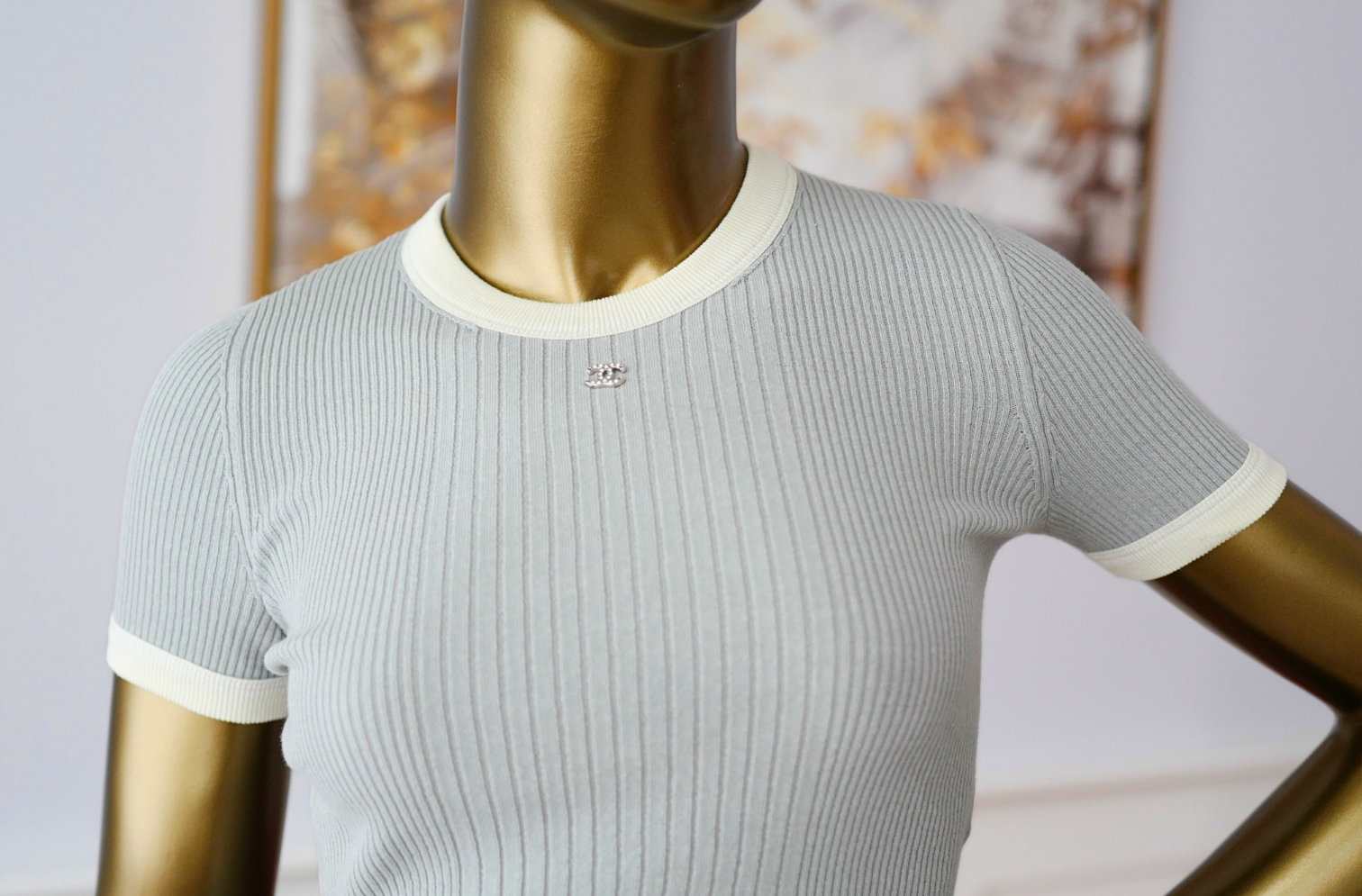 Infused with delicate pastel undertones inspired by serene seaside palettes, the design is anchored by the iconic Chanel logo subtly positioned at the chest—an emblem of timeless prestige. The classic crew neckline and clean short sleeves reflect Chanel’s impeccable tailoring and attention to detail, effortlessly merging comfort with couture.