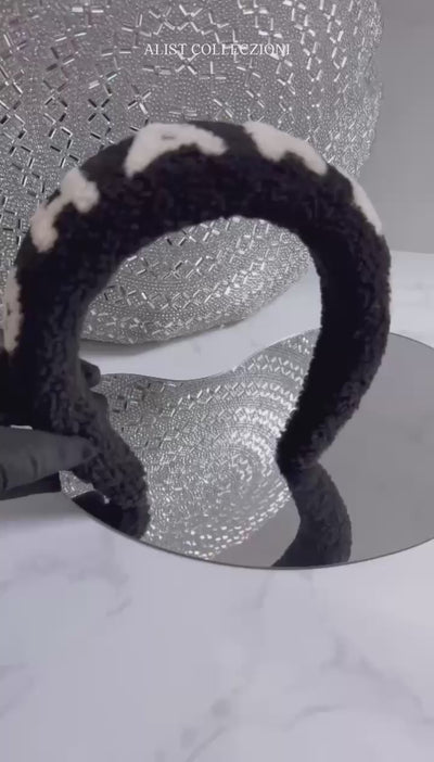 NEW 25B Chanel Headband Black Ecru Shearling Logo