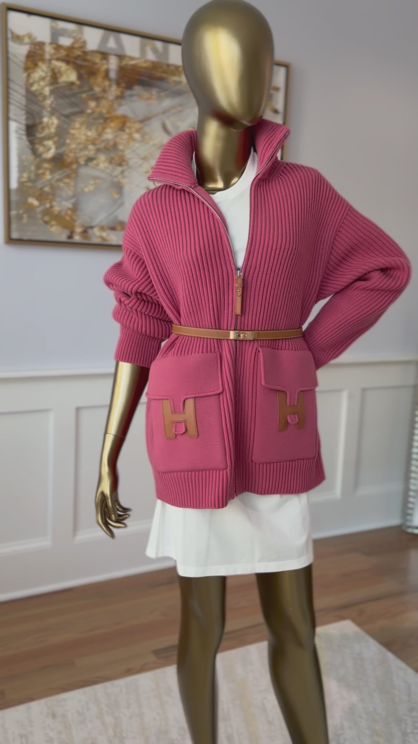 NEW Hermès Blouson Cardigan Jacket Rose Sorbet Wool with H Pockets Size 36