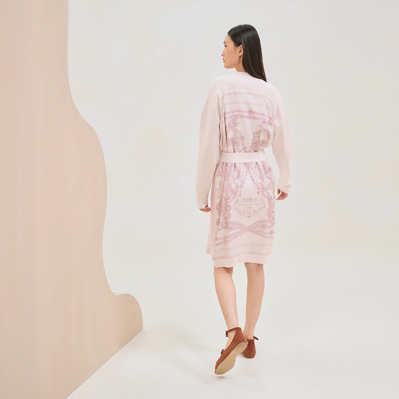 An exquisite fusion of silk scarf and knitwear, this Hermès Twillaine cardigan reimagines the iconic “Brides de Gala en Fleurs” motif in a silhouette that feels both vintage and modern. Inspired by the romantic elegance of the Petit Trianon and classic boudoirs, the design wraps the body in fluid silk while offering the cozy refinement of fine knit.