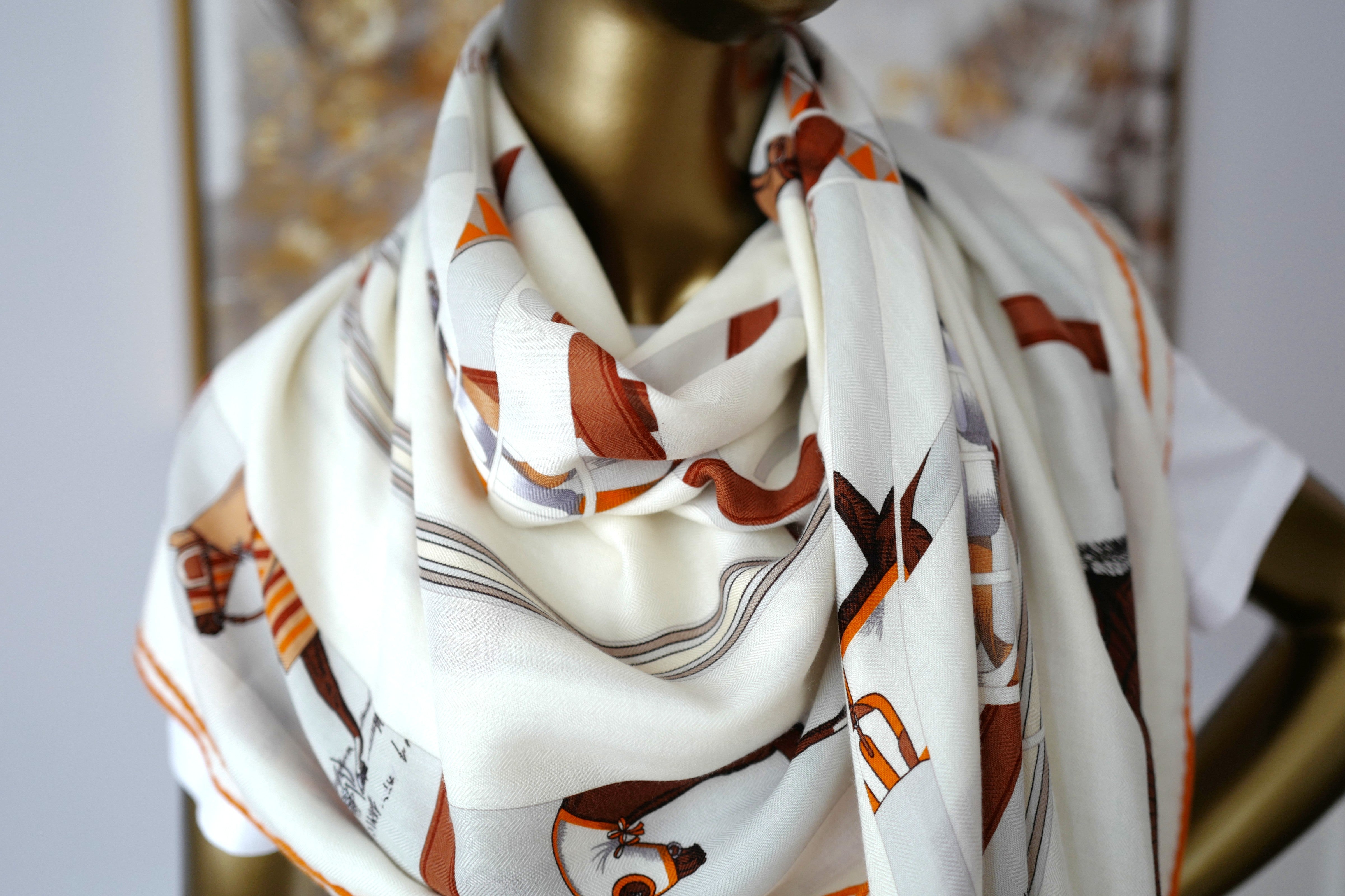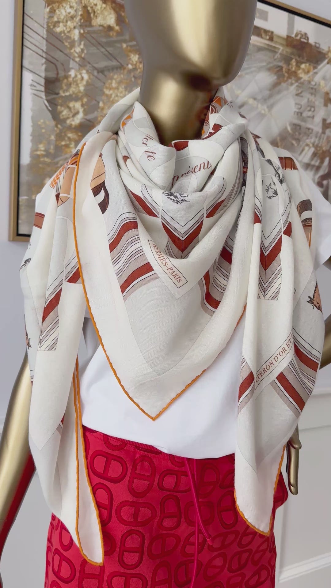 NEW Hermès Eperon d'Or et Tenues de Jour Shawl 140 in Blanc / Caramel / Orange