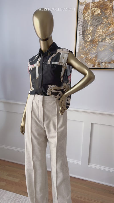 - Details & Features: Sleeveless beach shirt, Lightweight printed cotton voile, “Ferronnerie Remix” motif inspired by Hermès equestrian heritage, Crisp cotton poplin collar, Button placket, Front patch pocket with decorative buckle design