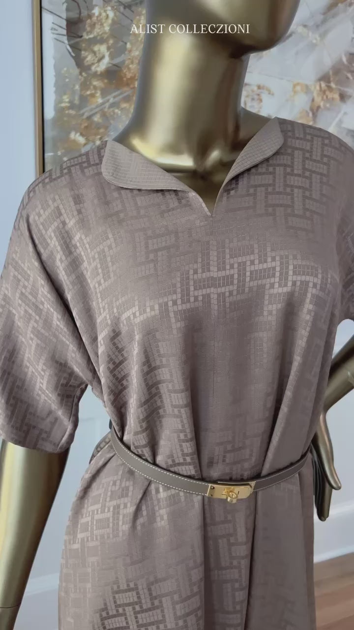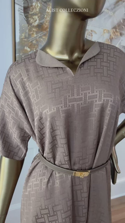 Discover timeless elegance with the Hermès Mosaique Belted Caftan Dress in Jacquard Silk, presented in the refined shade of Gris Étoupe. This luxurious piece is crafted in France from premium jacquard silk, showcasing a subtle geometric Mosaique pattern woven into the fabric. Its understated design reflects Hermès’ mastery of quiet luxury, perfect for any sophisticated wardrobe.