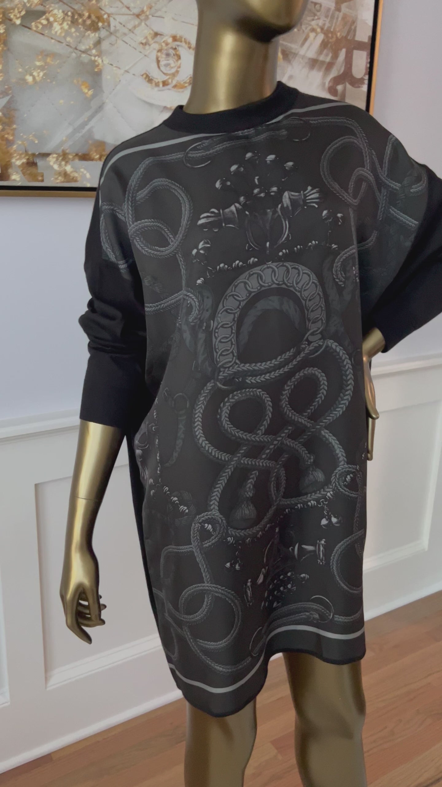 - Details: Crewneck neckline | Collar, cuffs, and bottom edges are ribbed trim | The front body features the “Palefroi Remix” printed silk scarf design | The silhouette is a tunic length (short dress)