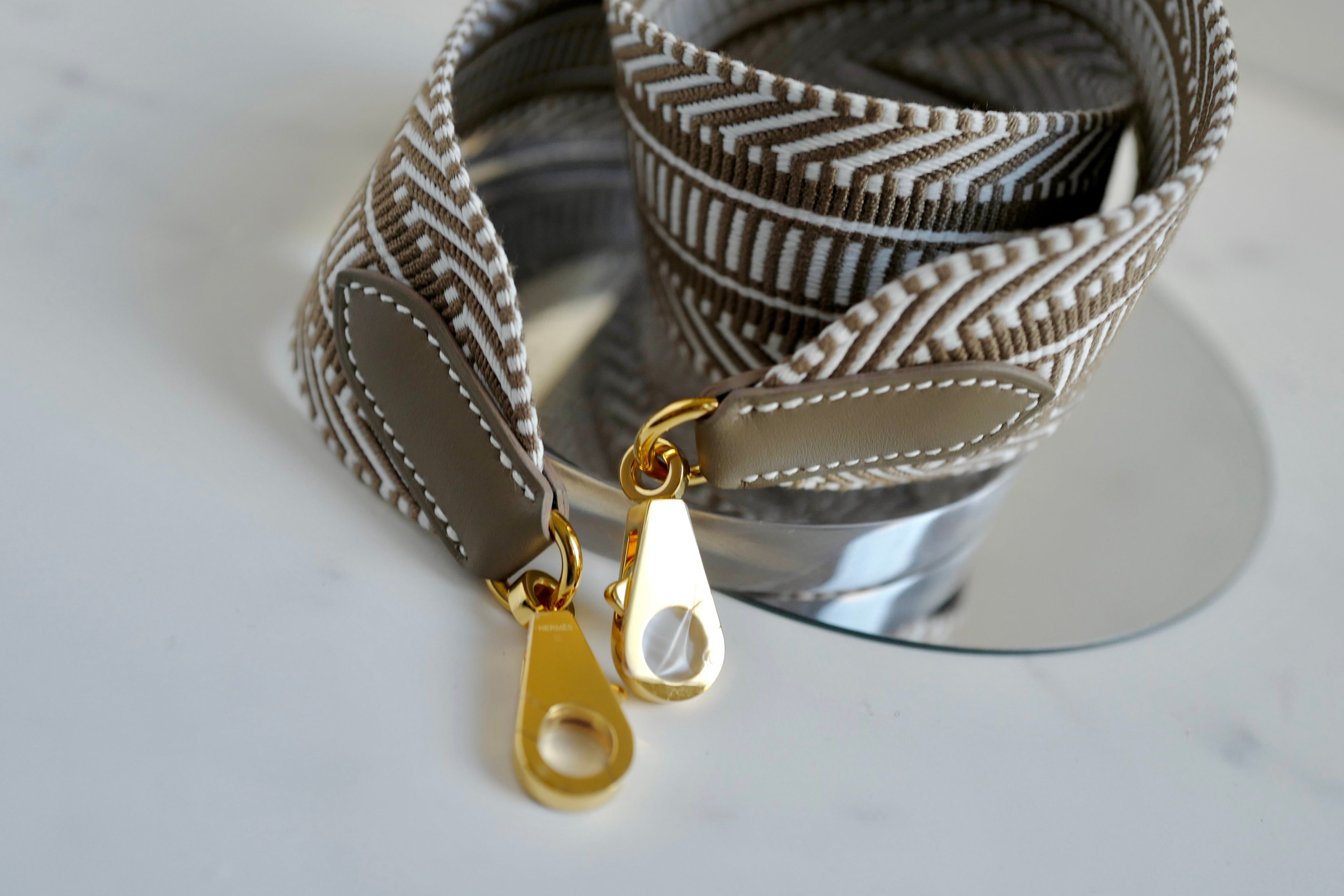 Featuring a sophisticated blend of white and Etoupe canvas, this strap is accented with the signature gold hardware, adding a touch of timeless elegance. Perfectly suited for your Hermes bag or any other piece requiring a statement upgrade, this 70 cm strap is designed for comfort and versatility, effortlessly enhancing any look with its understated yet chic appeal.